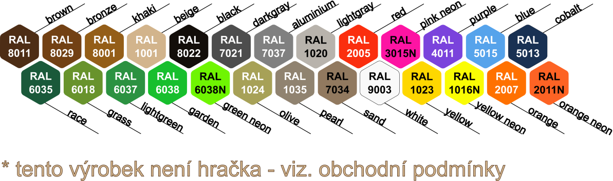 Standardně nabízíme několik "maskovaných" barev vhodných do přírodního prostředí, ale umíme vyrobit v jakékoli barvě budete chtít (stačí nám napsat).
